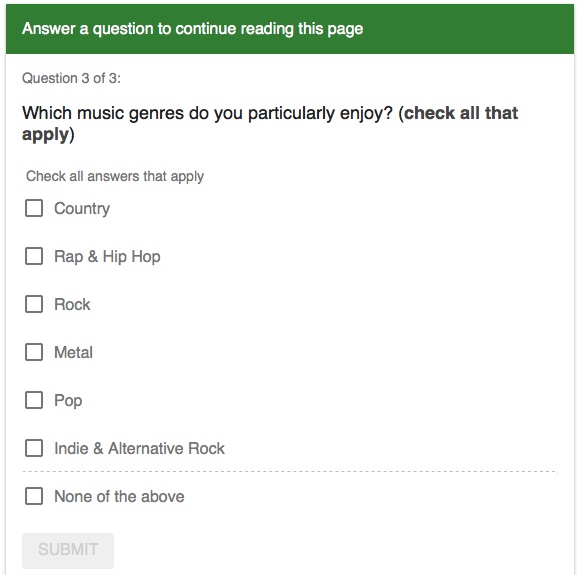 SKF NOTE: The Chicago Daily-Herald asks non-subscribers to take a reader survey in order to read an online a news report on the closing of a renowned store called The Drum Pad. Fair enough. But whatever the Daily-Herald intends for the data it collects, this question is totally skewed against jazz, latin, and classical music. At least! That is, unless people who listen to those music genres are not of interest to the survey maker.