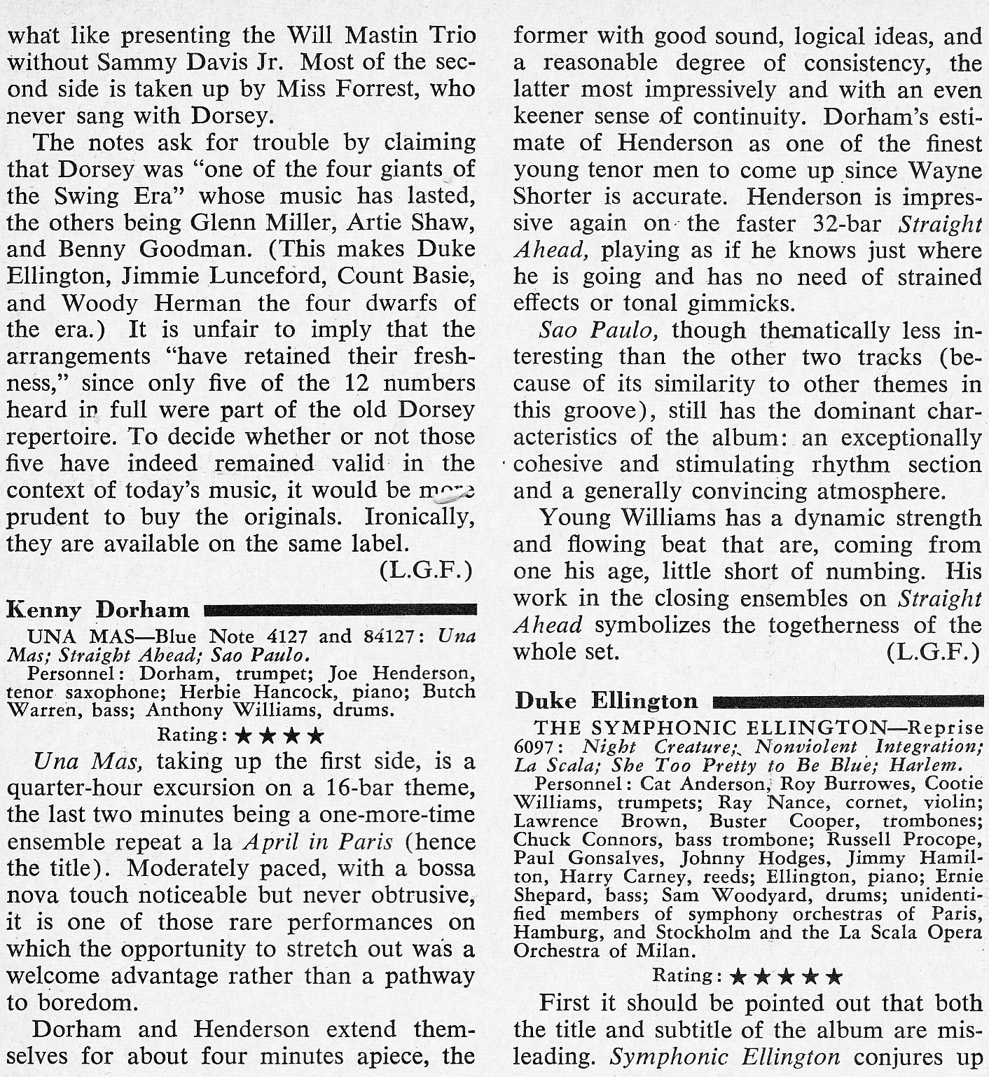SKF NOTE: Leonard Feather give Kenny Dorham’s classic Una Mas album four of five stars in the March 12, 1964 Down Beat. “Young [Tony] Williams,” Mr. Feather writes, “has a dynamic strength and flowing beat that are, coming from one his age, little short of numbing.” Indeed.