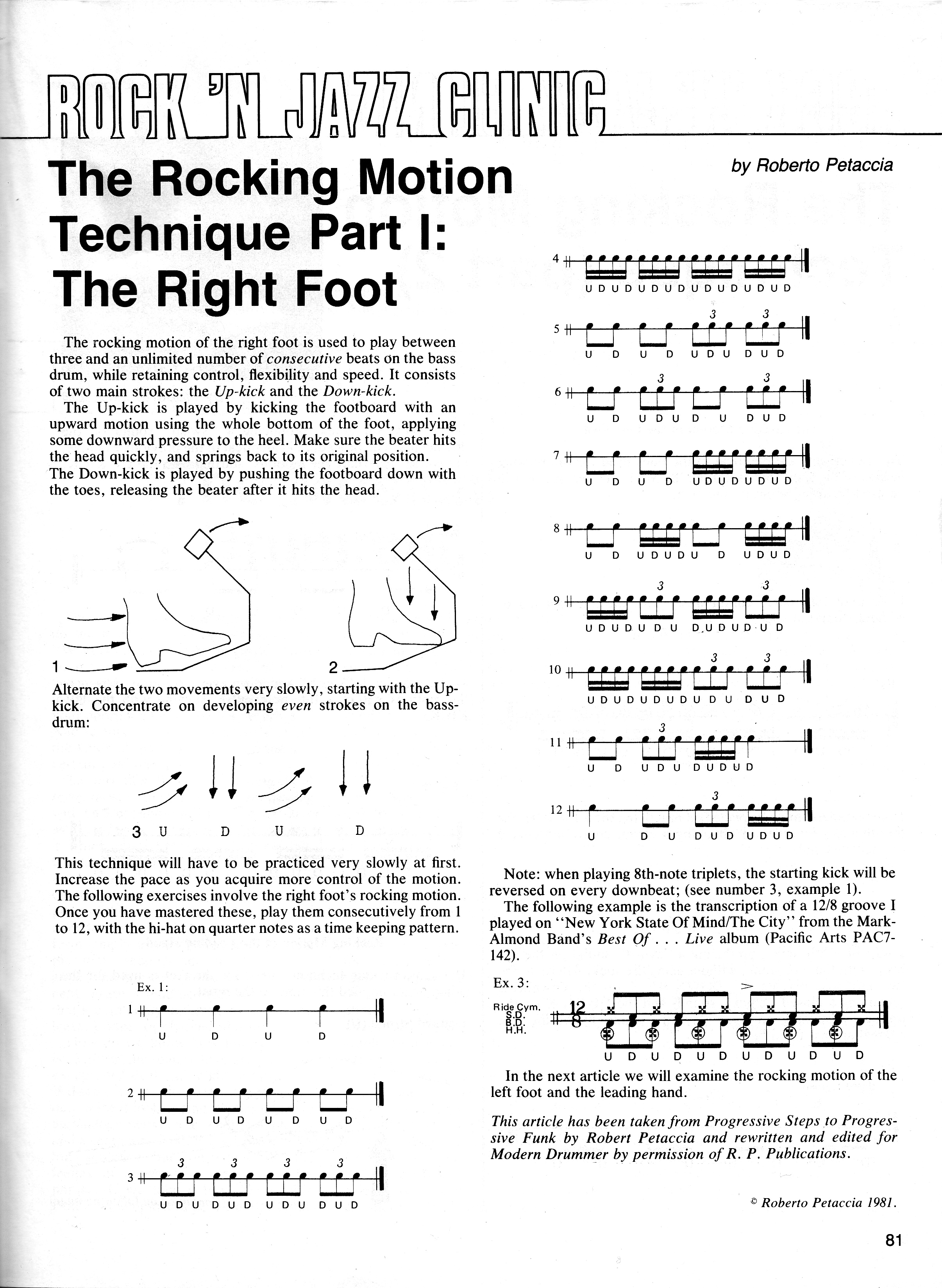 Here then is Roberto Petaccia’s The Rocking Motion Technique Part 1: The Right Foot as it first appeared in Modern Drummer.