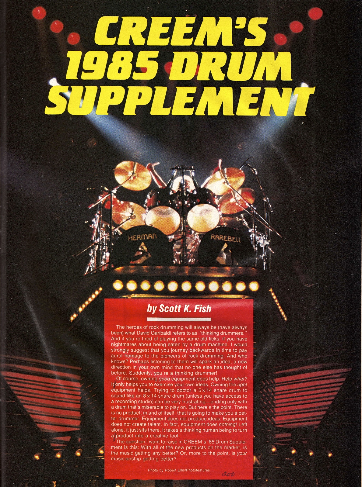 SKF NOTE: A once popular, now out-of-business, CREEM magazine hired me to produce American’s Only Rock ‘n’ Roll Magazine‘s 1985 Drum Supplement. It was a lot of work. From acoustic and electronic drumsets (high-end and budget), to cymbals, to hardware, to accessories, I had to decide what drum products to include.