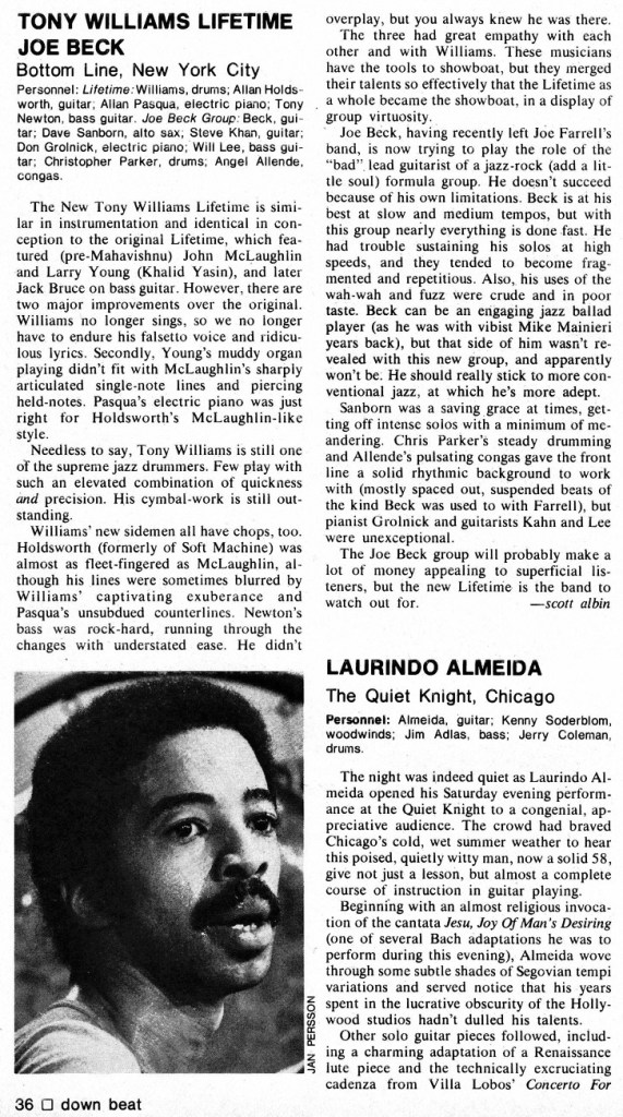 SKF NOTE: A 45-year old concert review (Down Beat, Oct. 9, 1975) of the Tony Williams Lifetime. Hard to imagine. This is the Fred Lifetime: Alan Holdsworth (gtr), Alan Pasqua (keyboards), Tony Newton (bass), and Tony Williams.