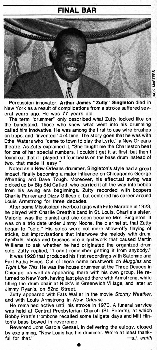 This October 9, 1975 Zutty Singleton obituary (Down Beat) reminds me of how difficult it was, for many years, to find records of some of the noted drummers. With the first historical drummers, like Zutty, who started recording in 1928, recording techniques didn’t do drummers justice. The popular 78-RPM records were limited to about two-and-a-half minutes per song. Drummers were often forced to record with partial drumsets. Bass drums, for instance, were verboten or covered with muffling blankets.