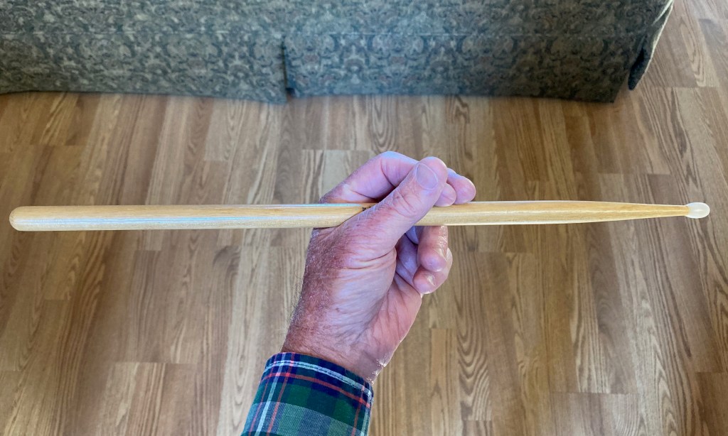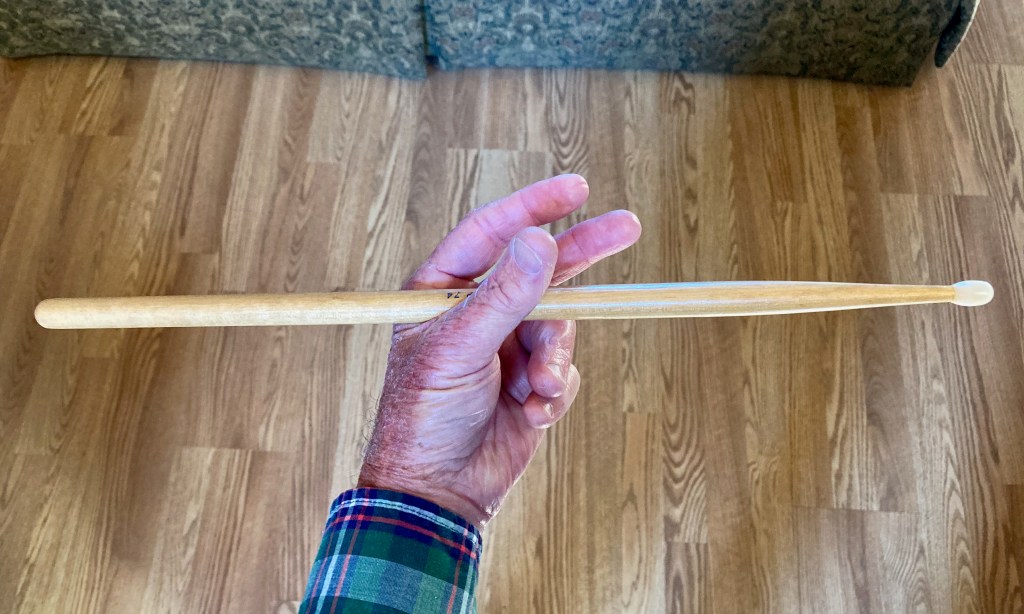 Freddie Gruber showed me, first, how to properly hold a drumstick in my left hand. Position the stick on the open fulcrum between my index finger and thumb, and adjust the position of the stick until, without the hand trying to hold the stick, it balances on that fulcrum. When the stick is balanced, said Freddie, that’s where you should hold it. (Photo 2).