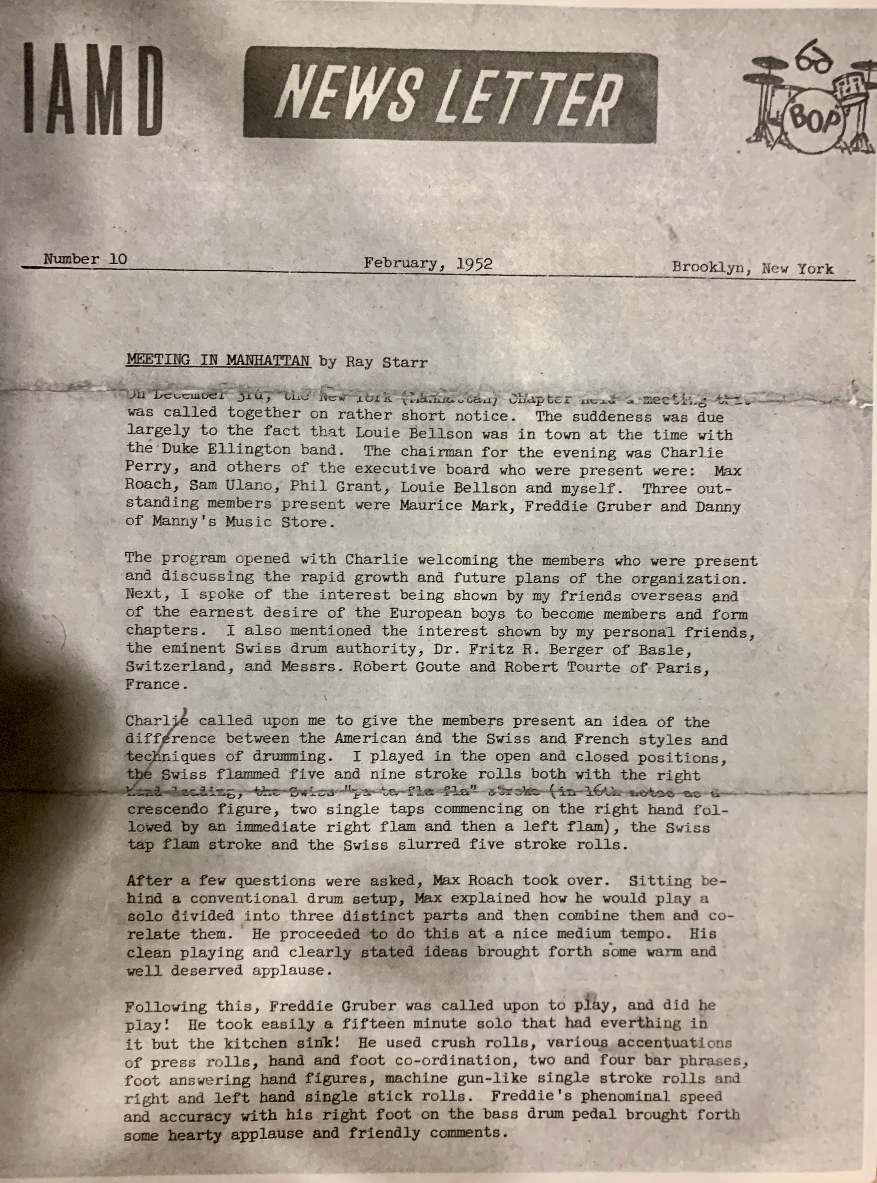 Finally, Neal sent me photos of a 1952 Newsletter by the New York Chapter of the International Association of Modern Drummers. This group is new to me, but the members at this meeting – including Max Roach and Louie Bellson – were quite impressive. The meeting included solos by several members, including Freddie Gruber. Ray Starr’s report on Freddie’s solo echoes what Jim Chapin and Barry Ulanov said about Freddie’s drumming.