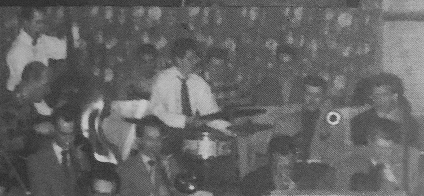 Following this, Freddie Gruber was called upon to play, and did he play! He took easily a fifteen minute solo that had everything in it but the kitchen sink! He used crush rolls, various accentuations of press rolls, hand and foot co-ordination, two and four bar phrases, foot answering hand figures, machine gun-like single stroke rolls and right and left hand single stick rolls. Freddie’s phenomenal speed and accuracy with his right foot on the bass drum pedal brought forth some hearty applause and friendly comments.