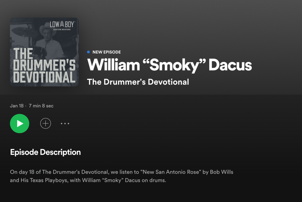 At any rate, I’m happy the interview was of help to Jeremy Brieske and his The Drummer’s Devotional. It’s a fun, instructive podcast available on Spotify.