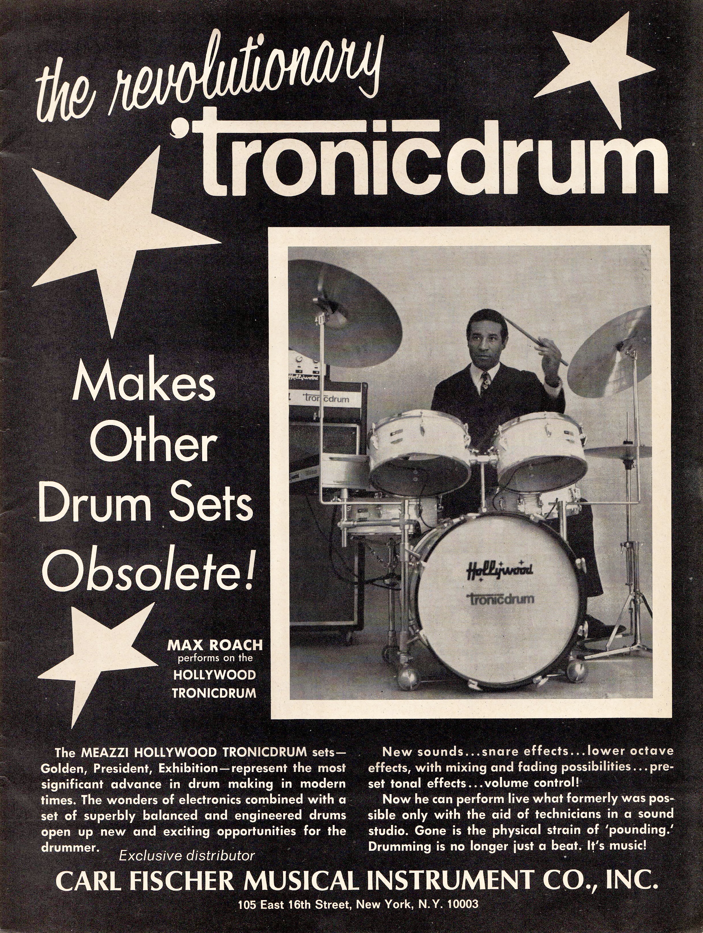 SKF NOTE: This 1968 full-page advertisement shows Max Roach behind Meazzi Hollywood Tronicdrums. With the gift of hindsight, we know Tronicdrums did not make “other drum sets obsolete.” But they are pioneers in the history of electronic drums.