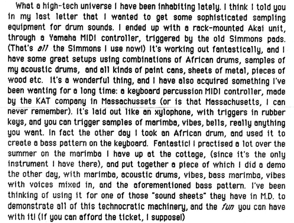 Written from Toronto on October 25, 1986 on Neil’s “new Macintosh computer,” this snippet has Neil sharing some insight into his use of electronic percussion.
