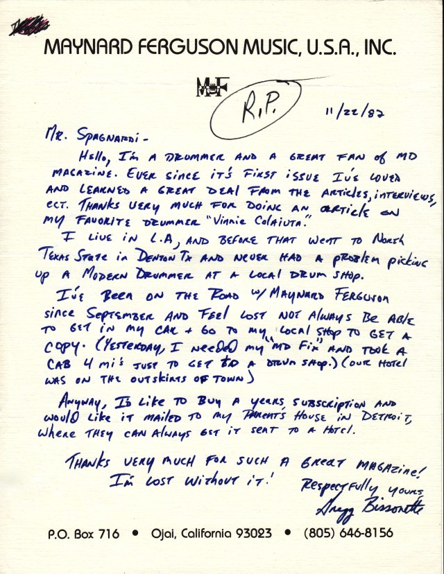 SKF NOTES: How times change! In November 1982 Gregg Bissonette sent his handwritten letter of introduction, on Maynard Ferguson stationary, to Modern Drummer Founder Ron Spagnardi.