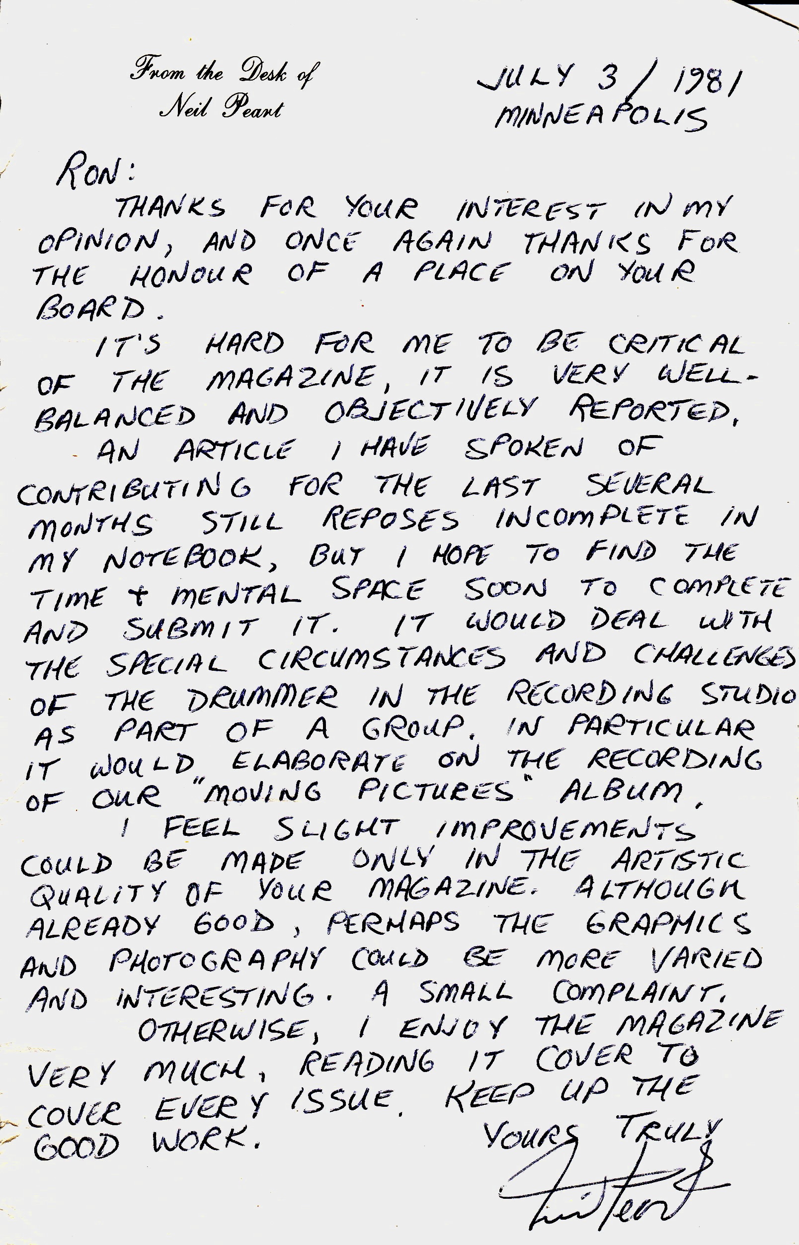 SKF NOTE: This handwritten note is Neil Peart accepting Modern Drummer Founder Ron Spagnardi’s invitation to join the MD Advisory Board.