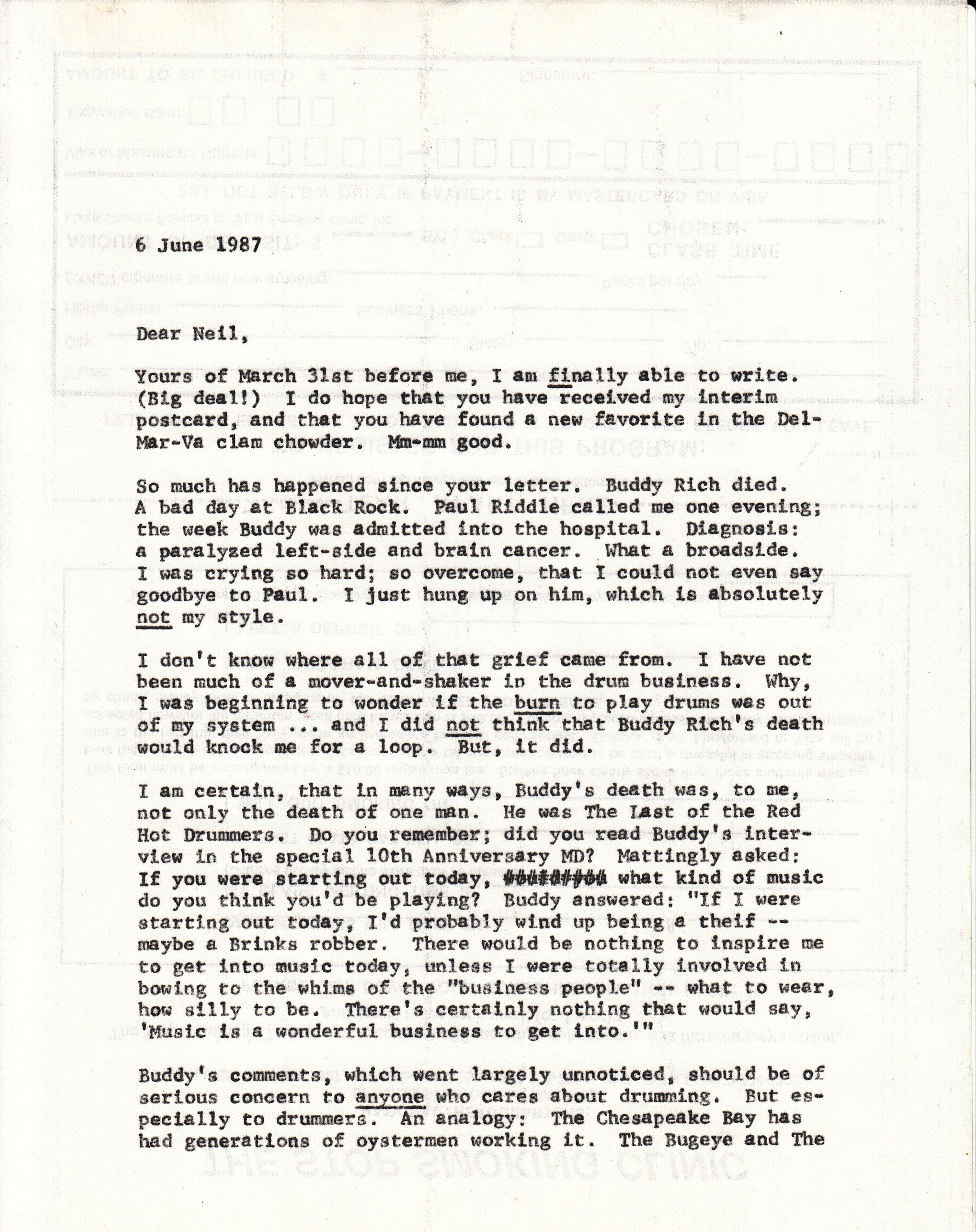 Interesting in retrospect is what I wrote Neil about Buddy Rich’s recent death. I may have Neil’s response somewhere. But reading this letter I am reminded of how distraught I was over Buddy’s death, and how puzzled I was at how very sad I felt.